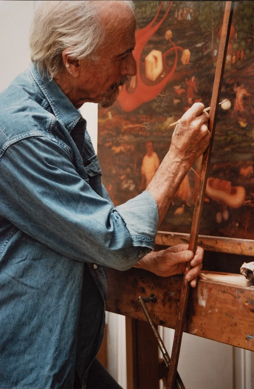 Wenn diese Untermalung trocken ist, beginne ich in einer zweiten Schicht Figuren und Landschaften zu modellieren und zu gliedern. In diesem Arbeitsvorgang muss das Bild in einem langwierigen Ringen erkämpft werden. Es folgt eine oft monatelange Pause, in der die Farbe gut trocknen muss. Ich versuche in dieser Zeit das Bild zu verdauen und zu vergessen.